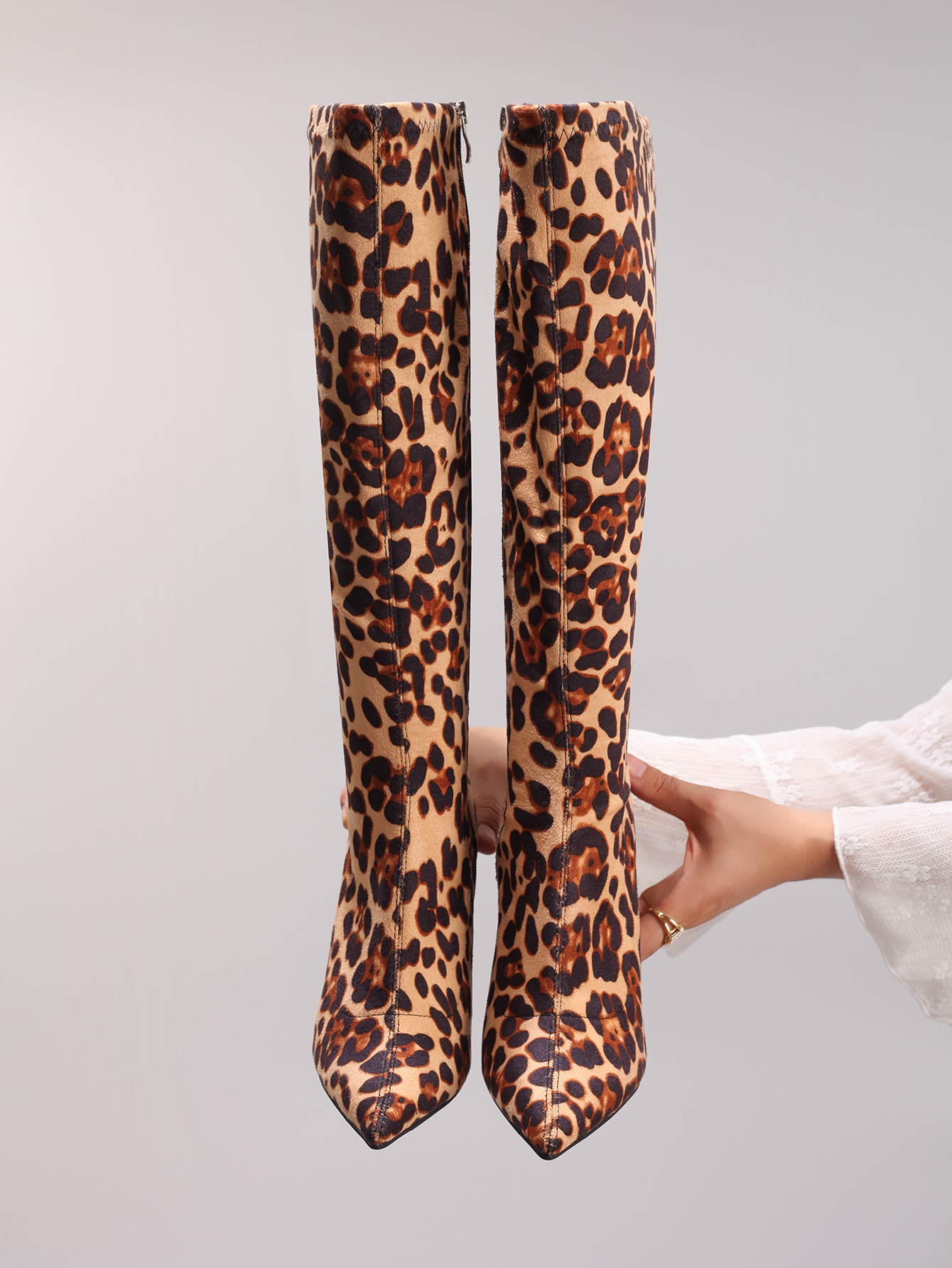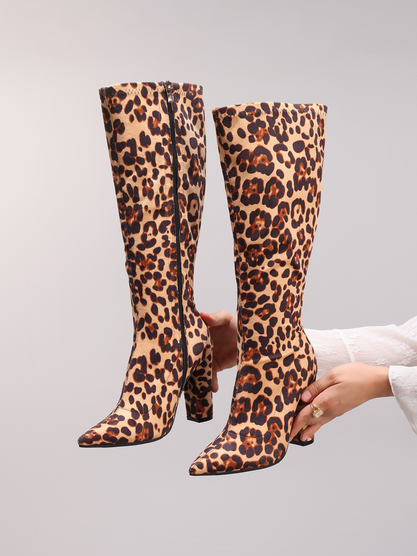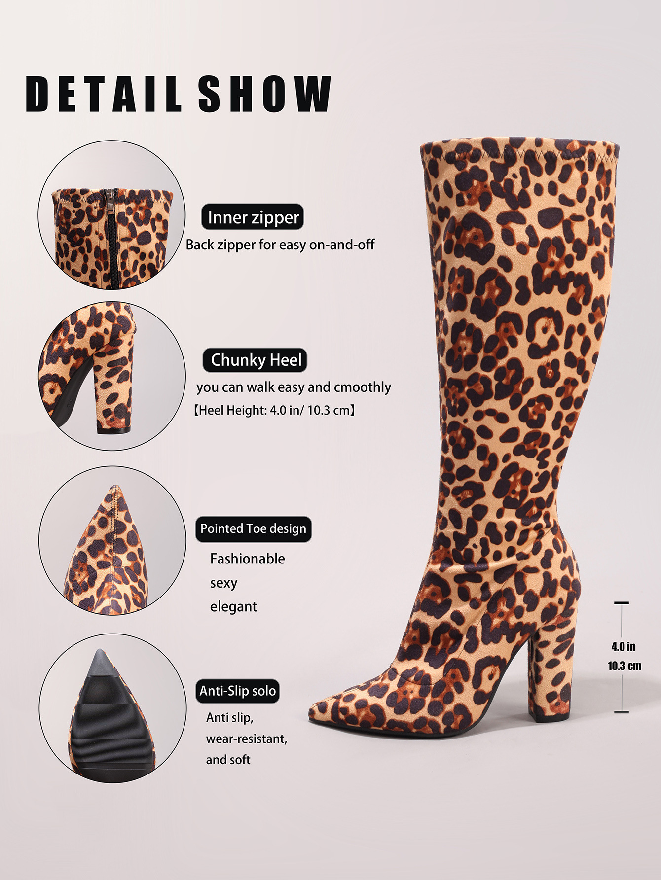 Fashion Leopard Print Long Boots Sexy Pointed Toe Side Zipper Chunky Heel Long Boots Party Prom Knee-High Boots Cross-Border Exclusive