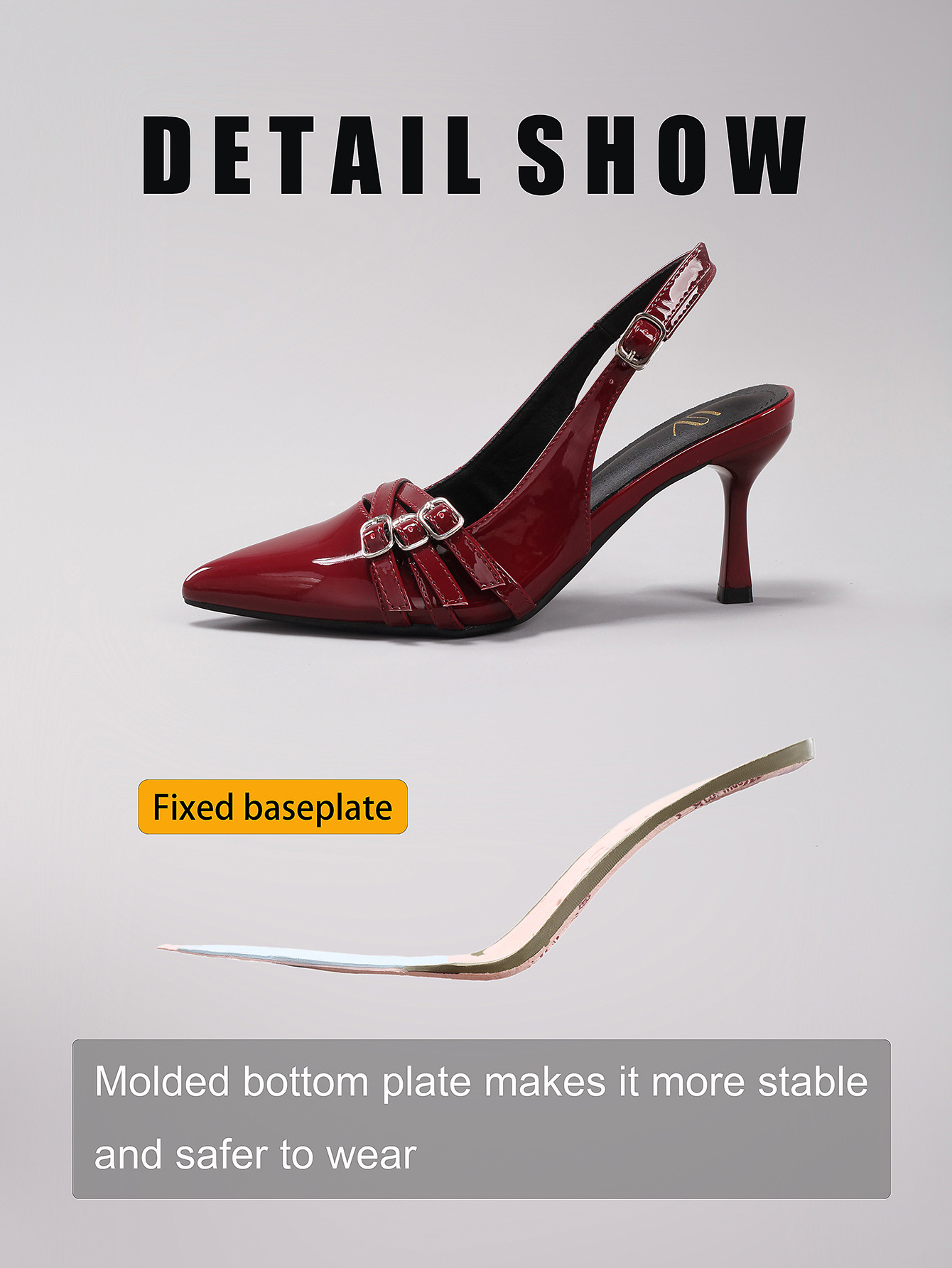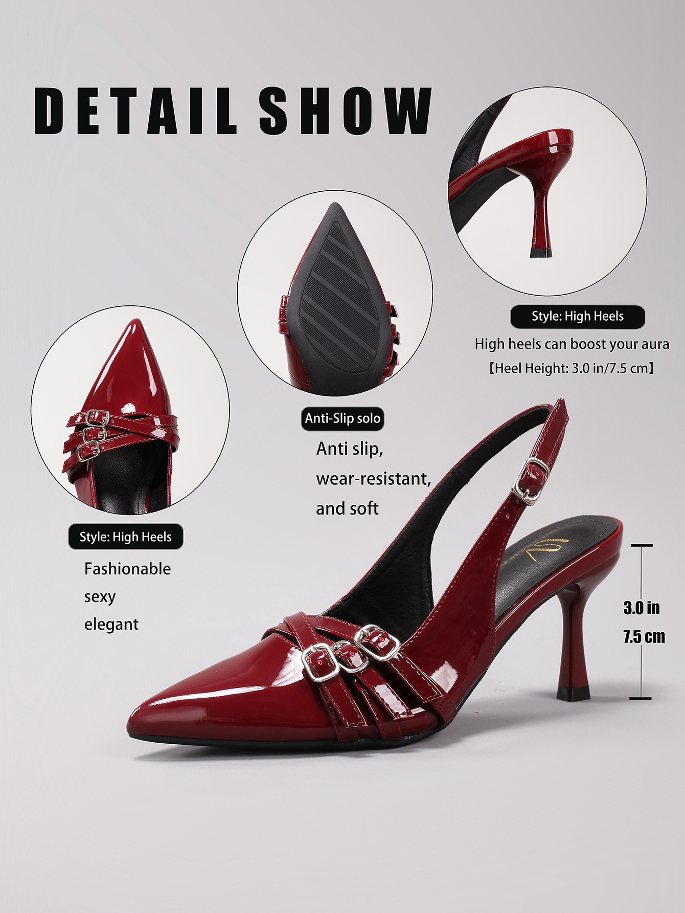 WEIBENA Women's High Heels with Metal Buckle Decoration, Burgundy Sexy Pointed Toe Kitten Heels, Fashion Party Sandals, Cross-border